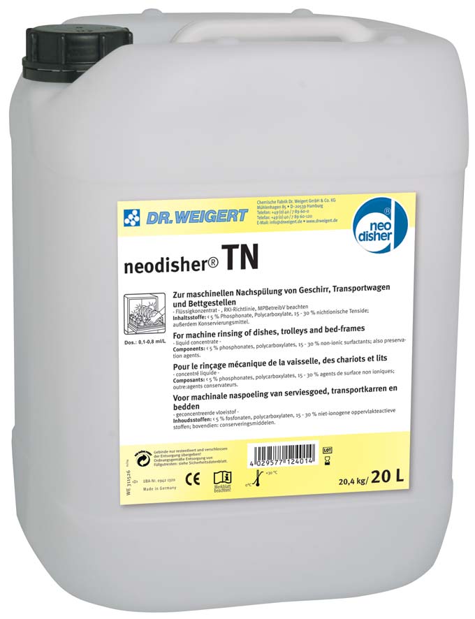 Środek płuczący, płyn. Do poprawienia suszenia trudnych do wyschnięcia materiałów tworzyw sztucznych w maszynowej dekontaminacji, neutralny odczyn. Pojemność: 20l, 200 kg