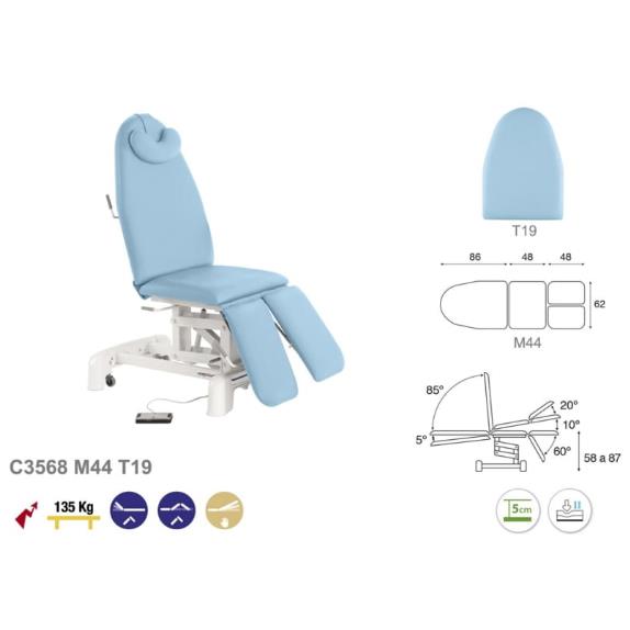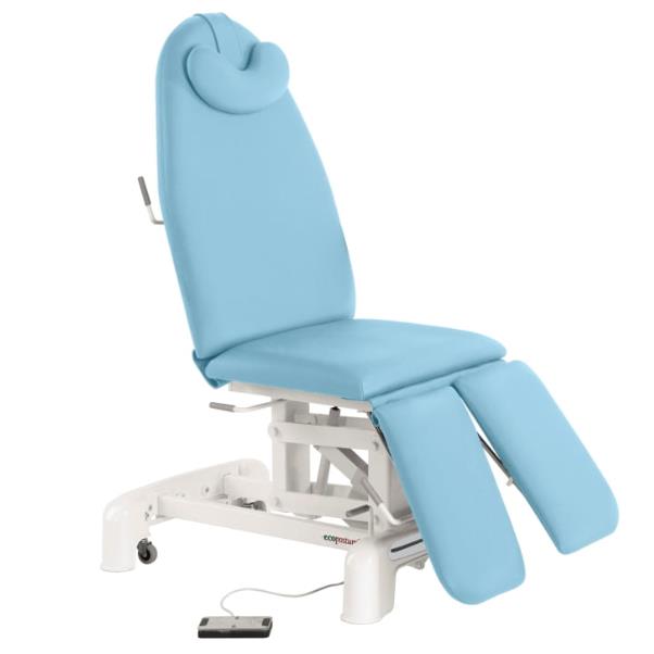 Zabiegowy fotel renomowanej marki Ecopostural ze zmiennopozycyjną regulacją siedziska , oparcia i podnóżka. Fotel posiada elektryczną regulację wysokości oraz funkcjonalny dzielony podnóżek, który sprawdza się w przypadku zabiegów kończyn dolnych jak drenaż limfatyczny. Fotel znajduje swoje zastosowanie również w podologii, gdzie ułatwianie dostępu do kończyn dolnych jest rzeczą niezbędną. Niezależna regulacja lewego i prawego podnóżka zwiększa dostęp i pozwala na uzyskanie pożądanej pozycji kończyny.