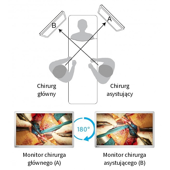 Niezależnie od orientacji kamery chirurgicznej, obraz może być obrócony o 180 stopni lub odbity, by zapewnić operatorowi najlepszy widok.