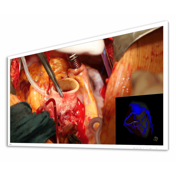 Panoramiczny, 58-calowy monitor chirurgiczny w rozdzielczości 4K UHD. Wyświetla obrazy bez opóźnień i migotania, a jego wysoki stopień ochrony IP ułatwia czyszczenie i dezynfekcję w sterylnym środowisku.