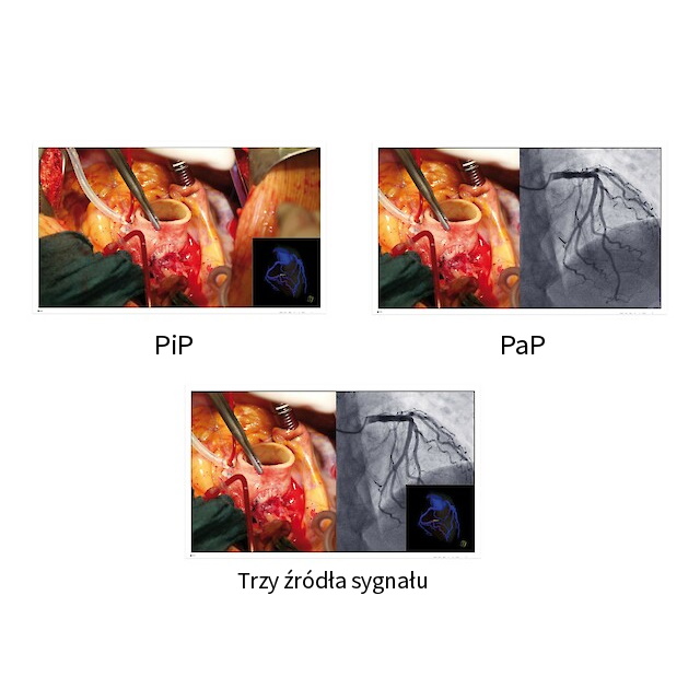 Na ekranie monitora można wyświetlać dwa źródła sygnału jednocześnie, korzystając z trybu PaP (Picture-and-Picture) wyświetlającego obrazy jeden obok drugiego. Z kolei w trybie PiP (Picture-in-Picture) drugi sygnał wyświetla się nad sygnałem głównym, a rozmiar i położenie okna można regulować. EX5841 umożliwia również wyświetlanie trzech źródeł sygnału naraz: dwa obok siebie i jedno nad nimi. Jest to szczególnie przydatne podczas operacji, które wymagają wyświetlania obrazów z różnych modalności.