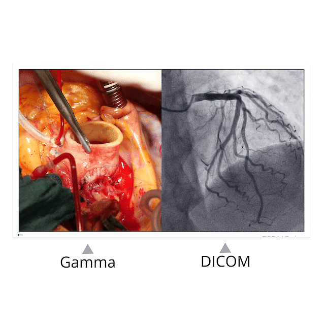 Gdy na ekranie wyświetlane są dwa źródła sygnału jednocześnie, tryb wyświetlania (Gamma lub DICOM) można ustawić dla obu z nich z osobna. Dzięki temu obrazy z różnych badań – endoskopii, tomografii komputerowej, rezonansu magnetycznego – wyświetlają się prawidłowo na jednym monitorze.