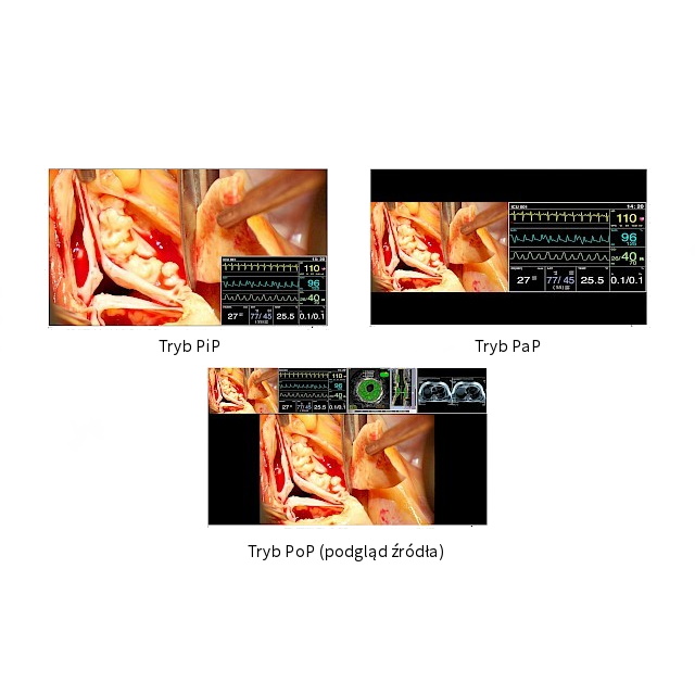 Monitor można z łatwością skonfigurować pod kątem wymagań sygnałowych konkretnej sali operacyjnej. Bogaty wybór złączy wejściowych i wejściowych zapewnia współpracę ze wszystkimi znajdującymi się na bloku operacyjnym systemami obrazowania. W zależności od rodzaju operacji personel medyczny może szybko przełączać się między obrazami endoskopowymi, rentgenowskimi w standardzie DICOM oraz obrazami z modalności wymagających specjalnego taktowania lub łączyć je z innymi.