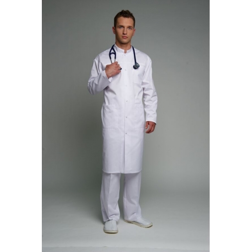 Fartuch Filip, kolor biały, długi rękaw. Zapinany na napy. Tabela wymiarów dostąpna w załączniku.