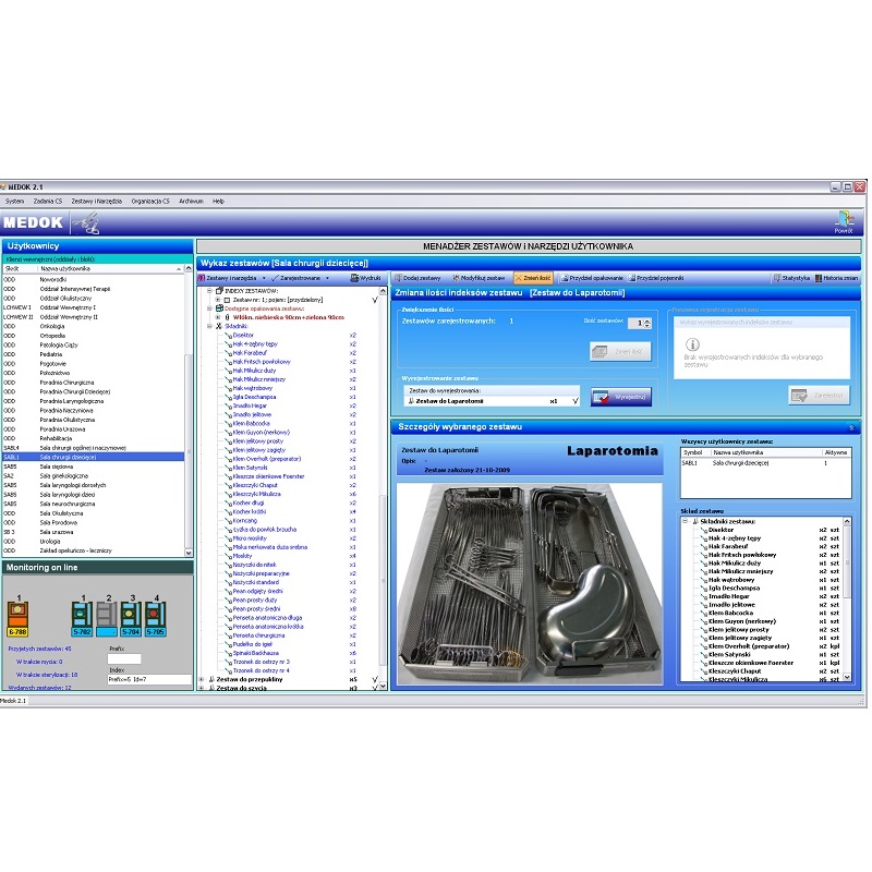 MEDOK CS jest przeznaczony do zarządzania obiegiem narzędzi i zestawów chirurgicznych na terenie centralnej sterylizatorni. W połączeniu z modułem MEDOK OUT, stanowi kompleksowe rozwiązanie dokumentujące i nadzorujące ścieżkę i obróbkę materiałów sterylnych na terenie całego szpitala – również na bloku operacyjnym i oddziałach.