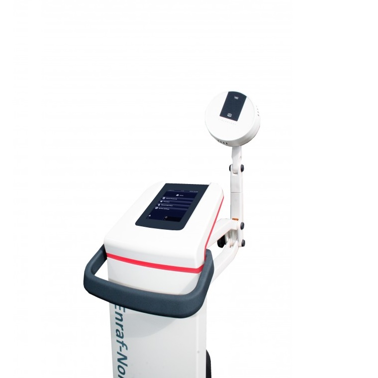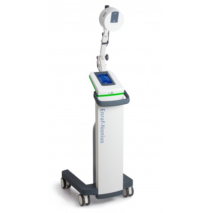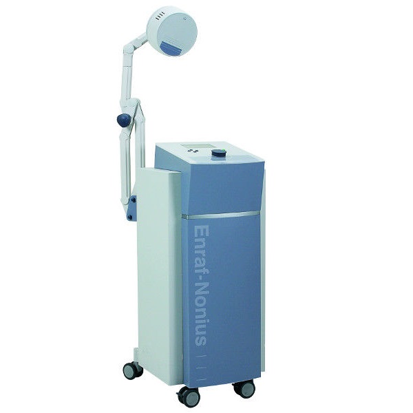 Diatermia krótkofalowa Curapuls 670 Enraf-Nonius. Wysokiej jakości urządzenie, typu "terapuls". Aparat wytwarza energię elektromagnetyczną z częstotliwością 27.12 MHz ± 0.16 MHz. Ze względu na impulsowy charakter pola elektromagnetycznego, wysoka moc szczytowa może być wytwarzana w bardzo krótkim czasie z występującym następnie długim okresem odpoczynku. Powoduje to bardzo intensywną stymulację tkanek. Curapuls 670 posiada dwa kanały, do których równocześnie można podłączyć dwie elektrody. Istnieje możliwość ustawienia niezależnych parametrów dla dwóch kanałów.