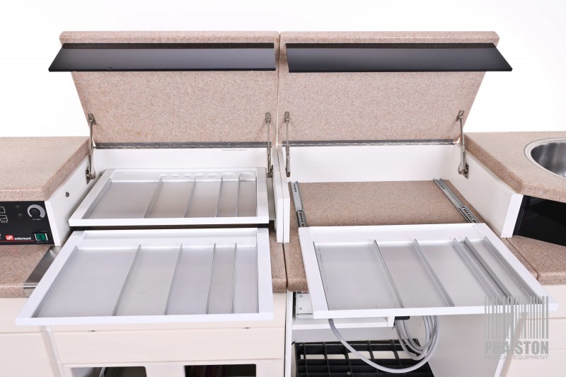 - Wysuwana półka na prowadnicach usytuowana pod górnym blatem, możliwość konfigurowania aluminiowych tacek według własnego uznania,