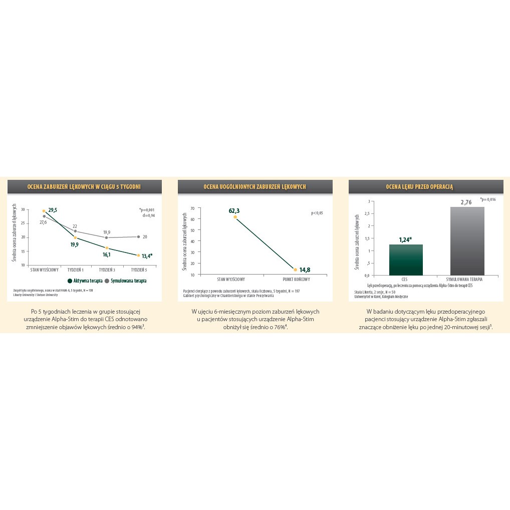 Ponad 95 zakończonych badań, opublikowane raporty, a także trwające badania, ankiety przeprowadzane u pacjentów i pozytywne opinie specjalistów jednogłośnie potwierdzają bezpieczeństwo i skuteczność urządzenia Alpha-Stim®. W przeprowadzanych na przestrzeni ostatnich trzech dekad badaniach z udziałem około 8800 pacjentów zgłaszano wyłącznie nieznaczne, samoistnie ustępujące działania niepożądane. Najczęściej były to bóle głowy (0,10%) oraz reakcje skórne w miejscu założenia elektrod (0,07%). W ciągu ostatnich 5 lat na 8 248 920 przeprowadzonych terapii Alpha-Stim® wystąpiło zaledwie 14 przypadków działań niepożądanych o łagodnym przebiegu, z których 11 dotyczyło podrażnienia skóry w miejscu założenia elektrody.