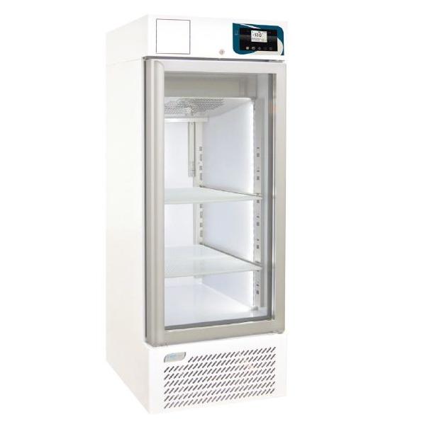 Szklane drzwi: 1 szt., na zawiasach, składające się z obwodowej ramy aluminiowej i trzech warstw hartowanego szkła izolacyjnego, z próżnią pomiędzy warstwami szkła w celu zwiększenia współczynnika izolacyjnego. Drzwi są wyposażone w gumową, magnetyczną i zdejmowaną uszczelkę, w celu zapewnienia idealnie hermetycznego zamknięcia oraz odwracalności urządzenia, czyli zmianie strony zawieszenia drzwi. Uchwyt jest wykonany z aluminium oraz na całej wysokości zintegrowany w profilu drzwi, dla większej wygody użytkowania. Drzwi są również wyposażone w sprężynowy mechanizm automatycznego zamykania dla kąta otwarcia poniżej 90° oraz specjalny włącznik drzwi, który zatrzymuje wewnętrzną wentylację przy otwartych drzwiach (aby ograniczyć stratę zimnego powietrza).