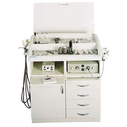 Unit laryngologiczny Evertop-T2 ze ssakiem i kompresją, obudowa malowana na srebrno, na kółkach,5 szuflad, z płaską powierzchnią pracy, taca na instrumenty, 2x ramię ze wsparciem (ssak, kompresja). 2 silniki.