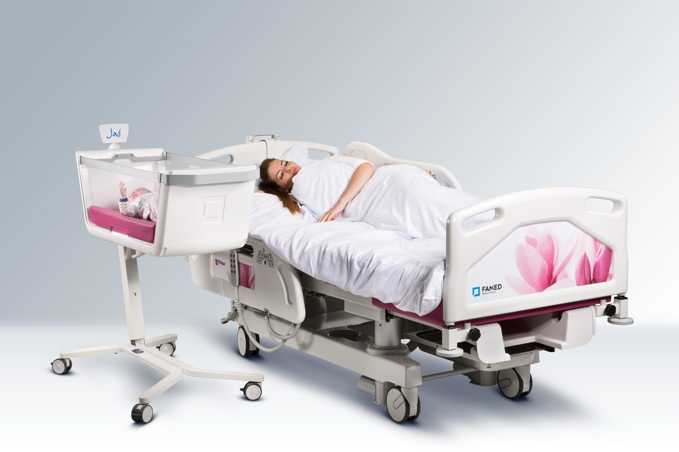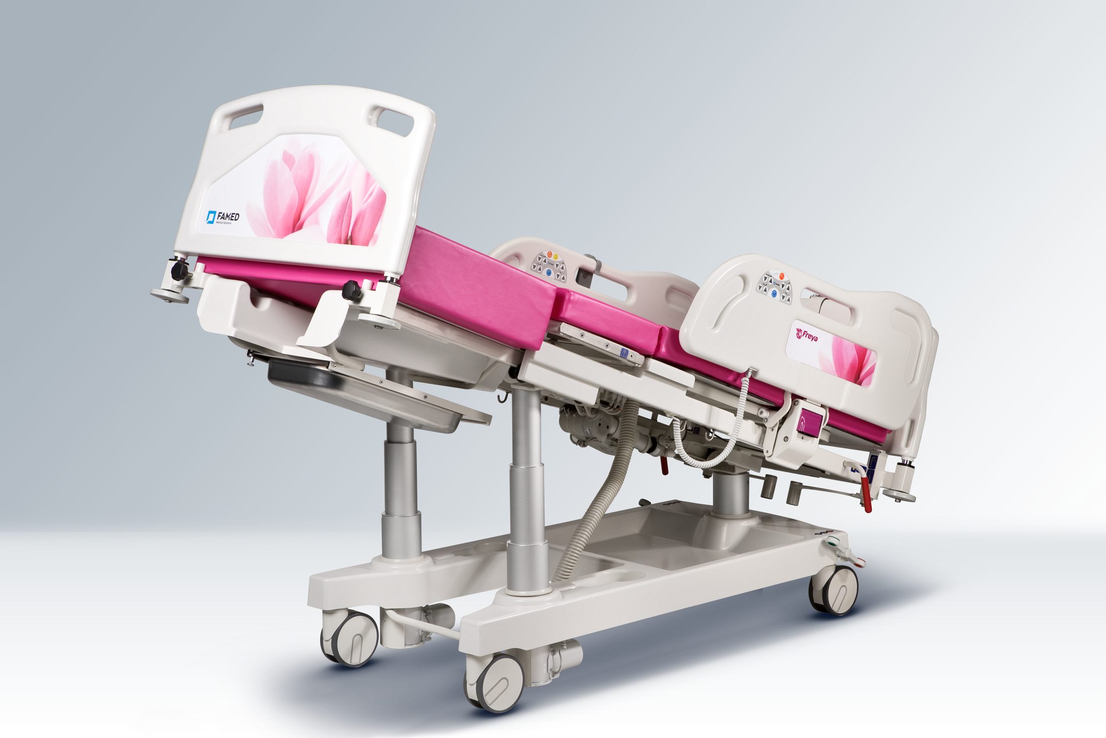 Famed Freya to łóżko o stabilnej, kolumnowej konstrukcji. Pozwoli przybrać dowolne pozycje porodowe. Barierki opuścić można poniżej poziomu leża, ułatwia to zejście z łóżka. Części tworzywowe wykonano z materiałów o właściwościach antydrobnoustrojowych w technologii pSilver™, materace zaś z tkanin antybakteryjnych, z klejonymi szwami. Wszystkie akcesoria mocowane są w pewny i stabilny sposób, zapewniając dobre podparcie podczas akcji porodowej.