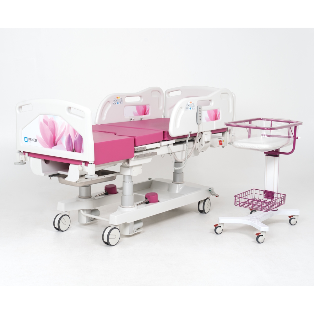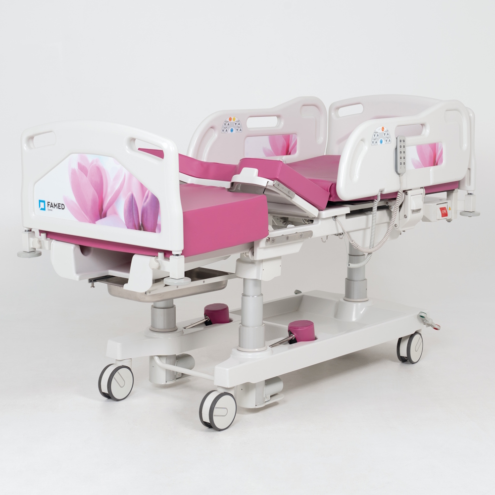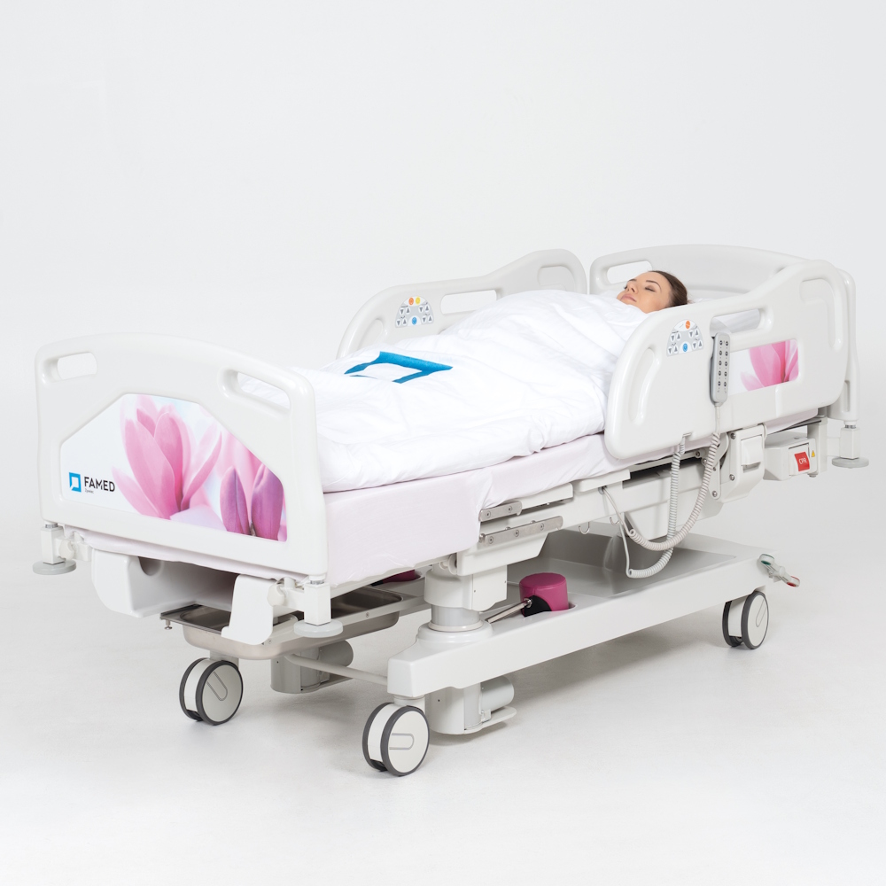 Famed FREYA może szybko przeobrazić się z łóżka szpitalnego w łóżko porodowe, spełnia jednocześnie normę PN-EN 60601-2-52 oraz posiada wygodne, opuszczane poręcze boczne. W podstawie łóżka znajdują się miejsca na odłożenie nieużywanych akcesoriów, a wszystkie przewody i elementy sterujące są osłonięte lub schowane, aby ułatwić czyszczenie i dezynfekcję. Famed FREYA jest łóżkiem w pełni sterowanym elektrycznie.