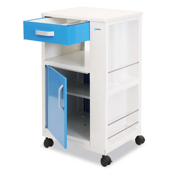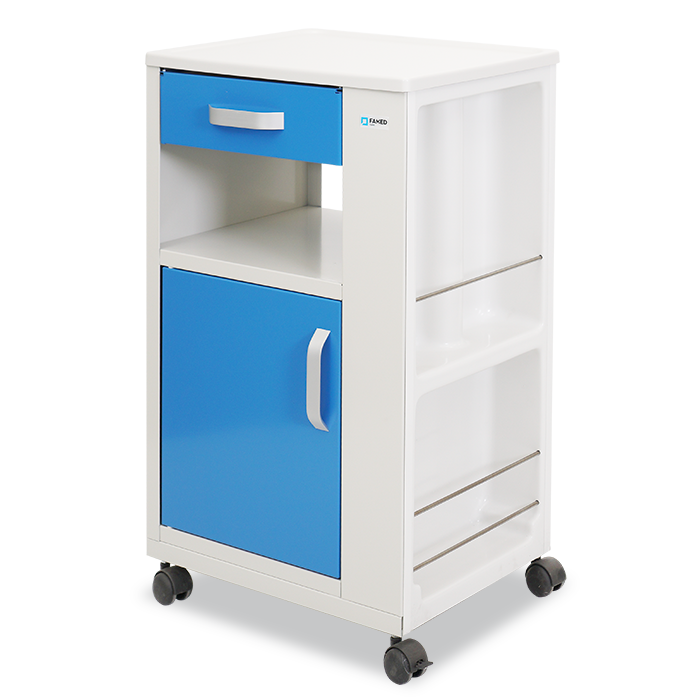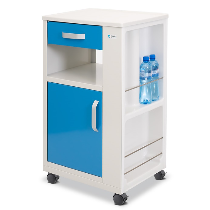 Prosta szafka szpitalna służąca do przechowywania rzeczy pacjenta. Dodatkowe miejsce na butelki lub inne przedmioty w ściance bocznej szafki zapewnia jeszcze większą swobodę przechowywania. Duża skrzynia z otworami wentylacyjnymi i dodatkową półką oraz pojemna szuflada, pozwolą utrzymać porządek w przedmiotach osobistych pacjenta.
