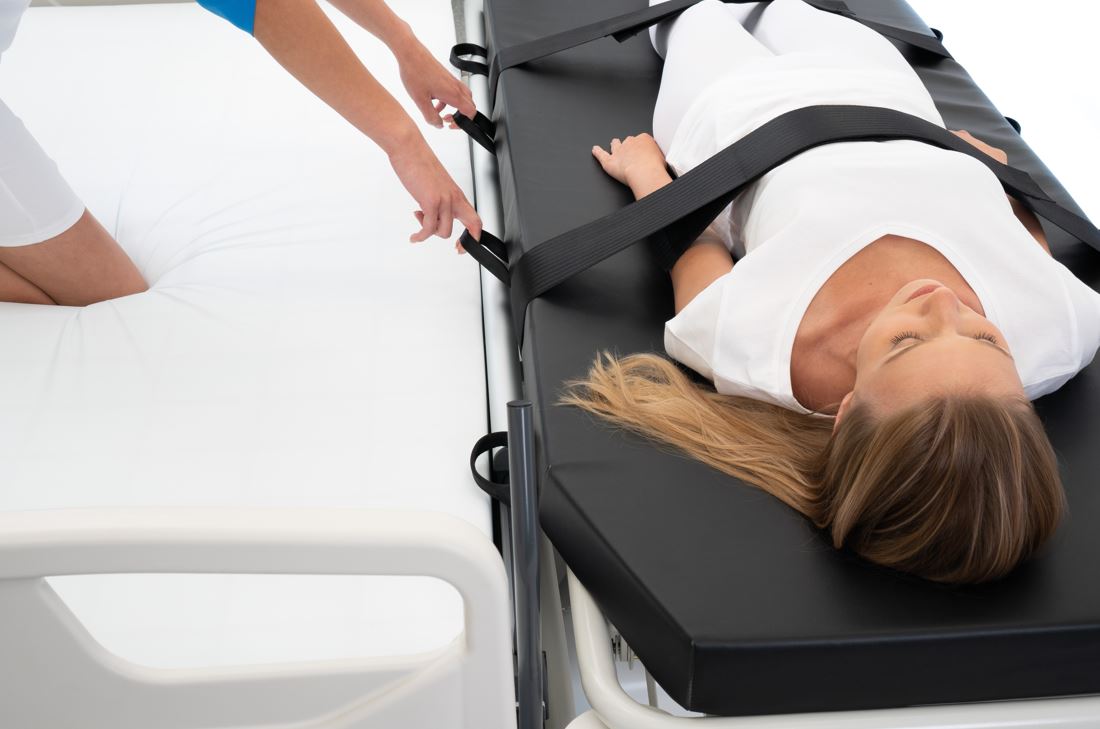 - Dostępny opcjonalnie materac z uchwytami do transferu pacjenta oraz z pasami zabezpieczającymi jego ciało na materacu.