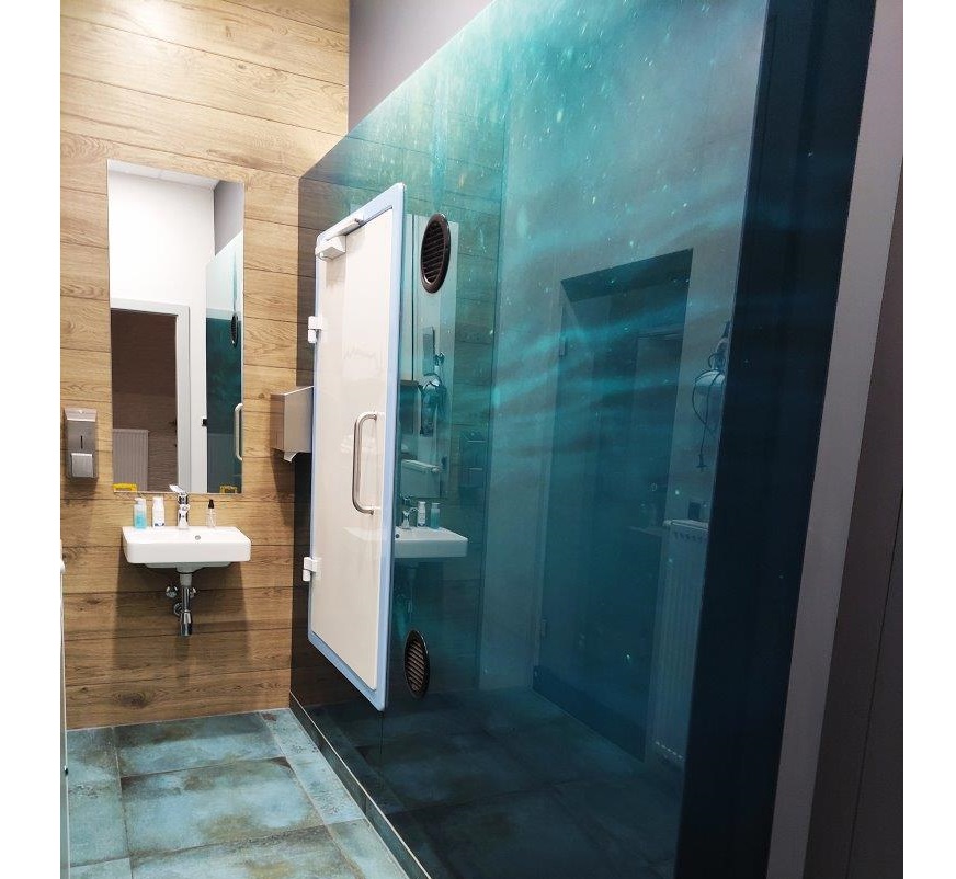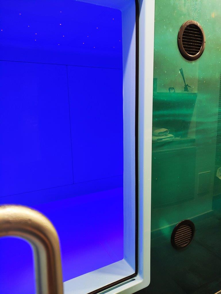 Wnętrze kabiny tworzy spójną, relaksującą przestrzeń – niebieska kolorystyka, podwodne oświetlenie LED i sufit typu „gwiaździste niebo” wprowadzają w stan głębokiego wyciszenia. Antypoślizgowe dno oraz sufit o strukturze antykondensacyjnej podnoszą komfort i bezpieczeństwo podczas każdej sesji.