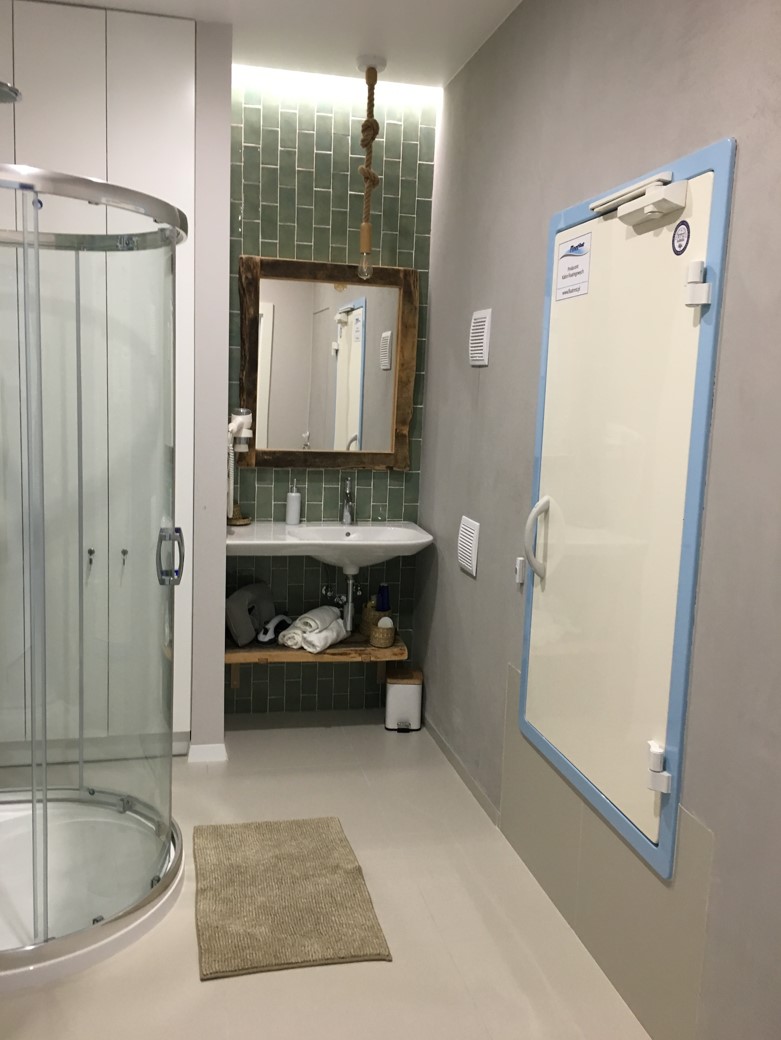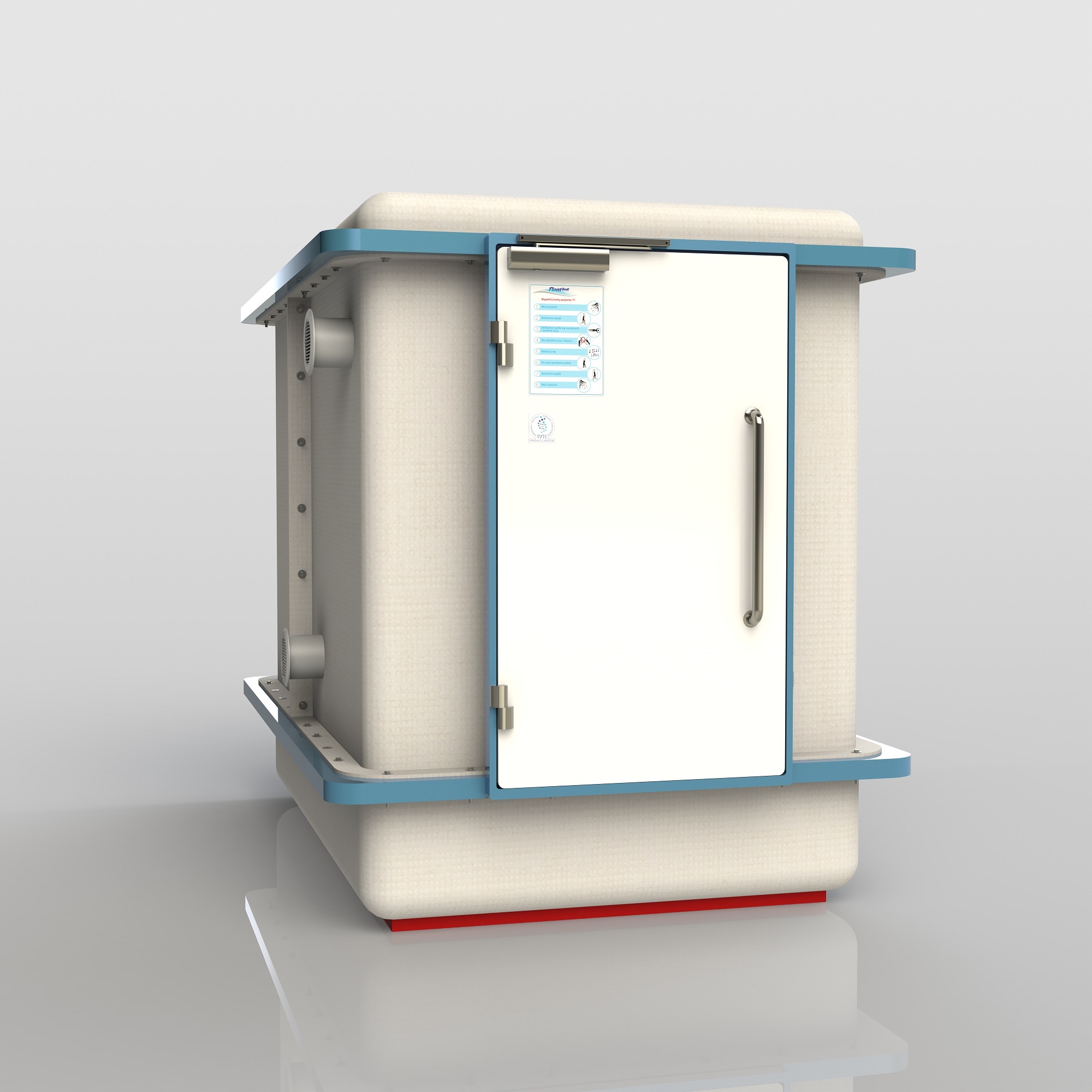 Drzwi mogą być zamontowane w dowolnej ścianie kabiny i otwierane w wybranym kierunku, co pozwala idealnie dopasować urządzenie do układu konkretnego pomieszczenia oraz zagwarantować komfort dla gości w obiekcie. Dodatkowo wewnątrz i przy wejściu umieszczono ergonomiczne uchwyty, ułatwiające bezpieczne wchodzenie i wychodzenie z kabiny, również osobom o ograniczonej sprawności ruchowej.
