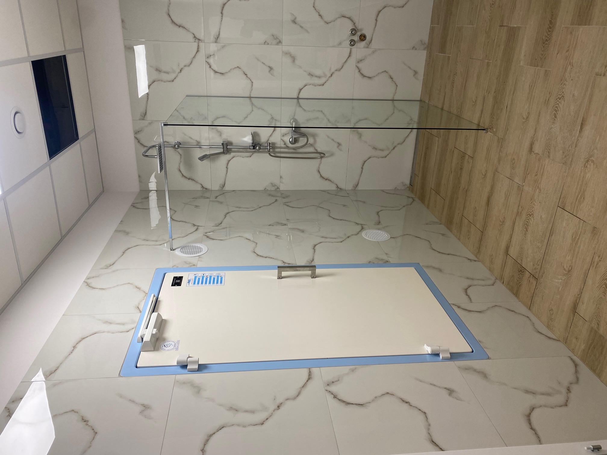 Kabina wyposażona jest w umieszczony pod dnem, precyzyjny system grzewczy 230 V o mocy 1200 W, który kontroluje temperaturę roztworu z dokładnością do 0,1°C i uruchamia się wyłącznie wtedy, gdy jest to potrzebne. Dzięki temu solanka utrzymywana jest w optymalnym zakresie przez cały seans, bez konieczności ciągłej pracy podgrzewania, co znacząco ogranicza zużycie energii.