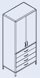 Szafa dwudrzwiowa z szufladami szafa w górnej części z trzema półkami, w dolnej części cztery szuflady. Konstrukcja mebli: profile aluminiowe i złączki tworzące trwałą i estetyczną konstrukcję mebli; profile aluminiowe anodowane o przekroju 25x25mm, w kolorze srebrnym; złączki wykonane z tworzywa ABS wzmocnione wewnątrz zatopionym elementem metalowym o dużej odporności mechanicznej; wypełnienie z płyty melaminowej; fronty szuflad i drzwi wykonane z płyty melaminowej, krawędzie zabezpieczone obrzeżem PVC w kolorze identycznym z kolorem korpusu o grubości 2 mm; półki w szafach zamkniętych pełnym frontem wykonane z płyty melaminowej, wszystkie krawędzie zabezpieczone obrzeżem PVC; półki w szafach o bokach i frontach oszklonych wykonane ze szkła, wszystkie krawędzie szlifowane; fronty szklane wykonane ze szkła bezpiecznego przeźroczystego o grubości 5 mm; blaty robocze wykonane z płyty wiórowej laminowanej laminatem wysokociśnieniowym odpornym na środki dezynfekujące, grubość blatu 28 mm, krawędzie zabezpieczone obrzeżem PVC; dla pomieszczeń socjalnych odporność termiczna blatów roboczych na temperaturę 200o C; szafki stacjonarne posiadają nóżki o wysokości 120 mm z regulacją wysokości; kolorystyka wg. wytycznych klienta.