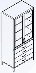 Szafa dwudrzwiowa przeszklona z szufladami szafa w górnej części z trzema półkami, drzwi szklane, w dolnej części cztery szuflady. Konstrukcja mebli: profile aluminiowe i złączki tworzące trwałą i estetyczną konstrukcję mebli; profile aluminiowe anodowane o przekroju 25x25mm, w kolorze srebrnym; złączki wykonane z tworzywa ABS wzmocnione wewnątrz zatopionym elementem metalowym o dużej odporności mechanicznej; wypełnienie z płyty melaminowej; fronty szuflad i drzwi wykonane z płyty melaminowej, krawędzie zabezpieczone obrzeżem PVC w kolorze identycznym z kolorem korpusu o grubości 2 mm; półki w szafach zamkniętych pełnym frontem wykonane z płyty melaminowej, wszystkie krawędzie zabezpieczone obrzeżem PVC; półki w szafach o bokach i frontach oszklonych wykonane ze szkła, wszystkie krawędzie szlifowane; fronty szklane wykonane ze szkła bezpiecznego przeźroczystego o grubości 5 mm; blaty robocze wykonane z płyty wiórowej laminowanej laminatem wysokociśnieniowym odpornym na środki dezynfekujące, grubość blatu 28 mm, krawędzie zabezpieczone obrzeżem PVC; dla pomieszczeń socjalnych odporność termiczna blatów roboczych na temperaturę 200o C; szafki stacjonarne posiadają nóżki o wysokości 120 mm z regulacją wysokości; kolorystyka wg. wytycznych klienta.
