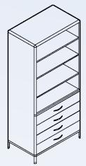 Szafa otwarta z szufladami szafa otwarta w górnej części z trzema półkami, w dolnej części cztery szuflady. Konstrukcja mebli: profile aluminiowe i złączki tworzące trwałą i estetyczną konstrukcję mebli; profile aluminiowe anodowane o przekroju 25x25mm, w kolorze srebrnym; złączki wykonane z tworzywa ABS wzmocnione wewnątrz zatopionym elementem metalowym o dużej odporności mechanicznej; wypełnienie z płyty melaminowej; fronty szuflad i drzwi wykonane z płyty melaminowej, krawędzie zabezpieczone obrzeżem PVC w kolorze identycznym z kolorem korpusu o grubości 2 mm; półki w szafach zamkniętych pełnym frontem wykonane z płyty melaminowej, wszystkie krawędzie zabezpieczone obrzeżem PVC; półki w szafach o bokach i frontach oszklonych wykonane ze szkła, wszystkie krawędzie szlifowane; fronty szklane wykonane ze szkła bezpiecznego przeźroczystego o grubości 5 mm; blaty robocze wykonane z płyty wiórowej laminowanej laminatem wysokociśnieniowym odpornym na środki dezynfekujące, grubość blatu 28 mm, krawędzie zabezpieczone obrzeżem PVC; dla pomieszczeń socjalnych odporność termiczna blatów roboczych na temperaturę 200o C; szafki stacjonarne posiadają nóżki o wysokości 120 mm z regulacją wysokości; kolorystyka wg. wytycznych klienta.