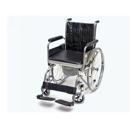 Wózek z funkcją toaletową wykonany został z ramy stalowej chromowanej. Siedzisko zdejmowane, wykonane z odpornego na zanieczyszczenia i wodę tworzywa sztucznego. Podłokietniki występują w wersji długiej z funkcją uchylania. Wózek wyposażony został w pełne gumowe koła oraz wytrzymałe stalowe szprychy. Podnóżki dostępne są w wersji standardowej (uchylnej). Koła tylne (22”), przednie (6”). Wózek wyposażony dodatkowo w wyjmowany pojemnik sanitarny.