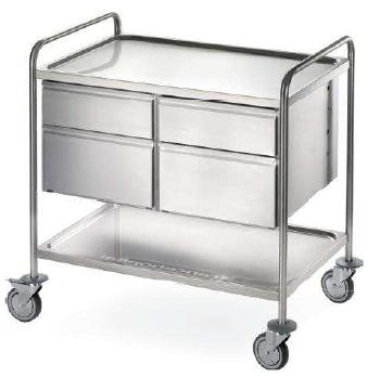 Materiał: stal nierdzewna. Koła 4 x 125 mm (2 z hamulcami). 2 szuflady 155 mm wysokości oraz 2 szuflady 235 mm wysokości.