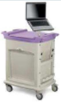Wózek z serii Ergodoc przeznaczony do obchodu. Wymiary bazy 920x650 mm. Konstrukcja ze stali malowanej proszkowo - fronty z próżniowo odlewanego plastiku. Na górze przestronny kontener 477x477 mm, wyposażony w ramę do zawieszania kart A4, pojemność ok.. 35 kart. Zamykany pod uchylnym blatem na zamek centralny. Fioletowy blat (580x480x1050 mm) z poliuretanu. Wbudowane uchwyty do prowadzenia z obu stron. Dwie boczne półki 18.16 cm. Uchwyt na płyn do dezynfekcji z paskami mocującymi. Uchylna półka. Przestrzeń na dodatkowy sprzęt 38x32x9 cm. Wydzielone miejsce na trzy pudełka z rękawiczkami jednorazowymi. Duży uchylny blat na zdjęcia rentgenowskie, laptopa lub ekran rentgenowski.