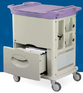 Wózek z serii Ergodoc przeznaczony do obchodu. Wersja z szufladami. Wymiary bazy 920x650 mm. Konstrukcja ze stali malowanej proszkowo - fronty z próżniowo odlewanego plastiku. Na górze przestronny kontener 477x477 mm, wyposażony w ramę do zawieszania kart A4, pojemność ok.. 35 kart. Zamykany pod uchylnym blatem na zamek centralny. Fioletowy blat (580x480x1050 mm) z poliuretanu. Wbudowane uchwyty do prowadzenia z obu stron. Dwie boczne półki 18.16 cm. Uchwyt na płyn do dezynfekcji z paskami mocującymi. Uchylna półka. Przestrzeń na dodatkowy sprzęt 38x32x9 cm. Wydzielone miejsce na trzy pudełka z rękawiczkami jednorazowymi. Duży uchylny blat na zdjęcia rentgenowskie, laptopa lub ekran rentgenowski.