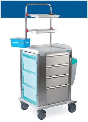 Wózek z serii Persocar. Wózek z szufladami 9 modułowy. 4 koła o średnicy 150 mm - dwa z hamulcem. Kostrukcja i szuflady ze stali malowanej proszkowo (antybakteryjne, antymikrobowe). Boki z zielonego, wzmocnionego ABS-u. Dostępne szuflady o wysokościach: 75 mm (1 modułowa); 155 mm (1 modułowa), 235 (1 modułowa), 315 mm (1 modułowa). Zamek centralny na klucz lub na plomby. Blat z podniesionymi 3 brzegami. Wbudowany uchwyt do prowadzenia. pomocnicza półka wysuwana spod blatu. Trzy uchylne, przezierne półki boczne. Kosz na odpady MAXIWALLY otwierany kolanem z wyjmowanym pojemnikiem o poj. 20 l. Masa 49 kg. Blat: 600x550 mm (na wysokości 1020 mm).
