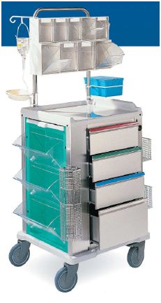 Wózek z serii Persolight. Wózek anestezjologiczny zabiegowy z szufladami. Dostępne szuflady w 4 wysokościach: 75 mm (1 modułowa), 155 mm (2 modułowa), 235 mm (3 modułowa), 315 mm (4 modułowa). Kolorowe paski do oznaczenia zawartości szuflad. Blat z podniesionymi 3 brzegami, jasnoszary. Kosz na odpady WALLY otwierany kolanem z wyjmowanym wkładem o poj. 8l. Zamek centralny na plomby. Uchwyt na butlę z tlenem. Uchwyt na cewniki. Płyta CPR. Pólka na defibrylator, regulowane wymiary, obrotowa o 360'. Wysięgnik na kroplówkę z 2 hakami i regulacją wysokości. Koła antystatyczne.