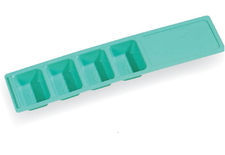 Dyspenser do leków z 4 przegródkami. Materiał polistyren. Wymiary 225x50x18 mm.