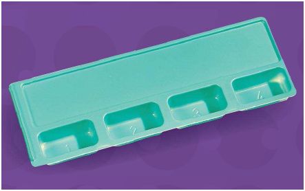 Dyspenser do leków z 4 przegródkami. Materiał polistyren. Wymiary 225x82x18 mm.