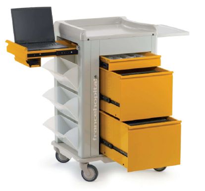 Wozek z serii Shango. Wózek pediatryczny 9 modułowy. Łączy cechy wózka medycznego z codziennym uzywaniem laptopa do wprowadzania danych pacjentów, sprawdzania recept, przeglądania zdjęć rentegowskich. Dodatkowa półka na laptop wyposażona jest w przestrzeń na kable i zasilacz oraz oddzielny zamek na klucz. Konstrukcja ze stali malowanej proszkowo z właściwościami antybakteryjnymi.Szuflady ze stali malowanej proszkowo w 3 kolorach: żółty, niebieski, zielony. Blat z trzema podniesionymi brzegami. Wbudowany uchwyt do prowadzenia. Szuflady w 4 wysokościach z zamkiem centralnym: 75 mm (1modułowa), 155 mm (2 modułowa), 235 mm( 3 modułowa), 315 mm (4 modułowa). Trzy przezierne uchylne półki boczne. Możliwość zamontowania wielu akcesoriów: nadstawka, szyny z regulowana wysokością, kosze na odpady, wysięgnik na kroplówkę, pojemnik na igły, półki ze stali nierdzewnej, plastikowe tace z podniesionymi brzegami, uchwyt na pudełko na rękawiczki jednorazowe, ochwyt na nerkę, pojemnik do dezynfekcji, półka na laptop, uchyt na cewniki. Waga: 62 kg. Koła 4x125 mm, 2 z hamulcem.