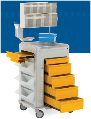 Wozek z serii Shango. Wózek zabiegowy (opatrunkowy) 9 modułowy. Łączy cechy wózka medycznego z codziennym uzywaniem laptopa do wprowadzania danych pacjentów, sprawdzania recept, przeglądania zdjęć rentegowskich. Dodatkowa półka na laptop wyposażona jest w przestrzeń na kable i zasilacz oraz oddzielny zamek na klucz. Konstrukcja ze stali malowanej proszkowo z właściwościami antybakteryjnymi.Szuflady ze stali malowanej proszkowo w 3 kolorach: żółty, niebieski, zielony. Blat z trzema podniesionymi brzegami. Wbudowany uchwyt do prowadzenia. Szuflady w 4 wysokościach z zamkiem centralnym: 75 mm (1modułowa), 155 mm (2 modułowa), 235 mm( 3 modułowa), 315 mm (4 modułowa). Trzy przezierne uchylne półki boczne. Możliwość zamontowania wielu akcesoriów: nadstawka, szyny z regulowana wysokością, kosze na odpady, wysięgnik na kroplówkę, pojemnik na igły, półki ze stali nierdzewnej, plastikowe tace z podniesionymi brzegami, uchwyt na pudełko na rękawiczki jednorazowe, ochwyt na nerkę, pojemnik do dezynfekcji, półka na laptop, uchyt na cewniki. Waga: 62 kg. Koła 4x125 mm, 2 z hamulcem.