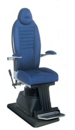 Fotel okulistyczny z hydrauliczną regulacją wysokości, wewnętrzną metalową ramą, uchylnym oparciem pleców oraz podłokietnikami. Zagłówek zintegrowany z oparciem pleców. Tapicerka różnokolorowa wykonana z syntetycznej skóry.