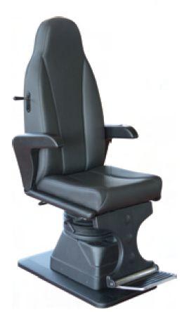 Fotel okulistyczny z hydrauliczną regulacją wysokości, wewnętrzną metalową ramą, uchylnym oparciem pleców oraz podłokietnikami. Zagłówek zintegrowany z oparciem pleców. Tapicerka różnokolorowa wykonana z syntetycznej skóry.