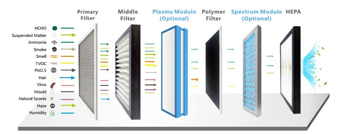 Zastosowany 6 stopniowy system filtracji oraz dezynfekcji plazmowej efektywnie zabija wirusy oraz bakterie, usuwa HCHO, TVOC oraz inne niebezpieczne gazy. Skuteczność naszego urządzenia wynosi 99.9%