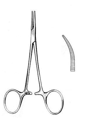 Kleszczyki typu Halstead-Mosquito, zagięte z ząbkiem o długości 12,5 cm.
