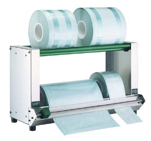 Obcinarka rękawów z dystrybutorem dwupoziomowym. Urządzenie przeznaczone do medycznych opakowań sterylizacyjnych, z wbudowanym narzędziem tnącym, które daje możliwość cięcia w obu kierunkach. Zabezpieczenie cięcia z 4 stron ostrza. PR-H50 może być montowana blisko zgrzewarki - na ścianie lub na stole roboczym. Wykonanie ze stali nierdzewnej AISI 304 i aluminium.