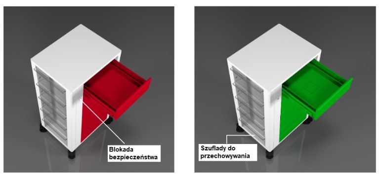 - czerwone wózki – zanieczyszczone endoskopy, wymagające powtórnego czyszczenia, by zapobiec kontaminacji krzyżowej