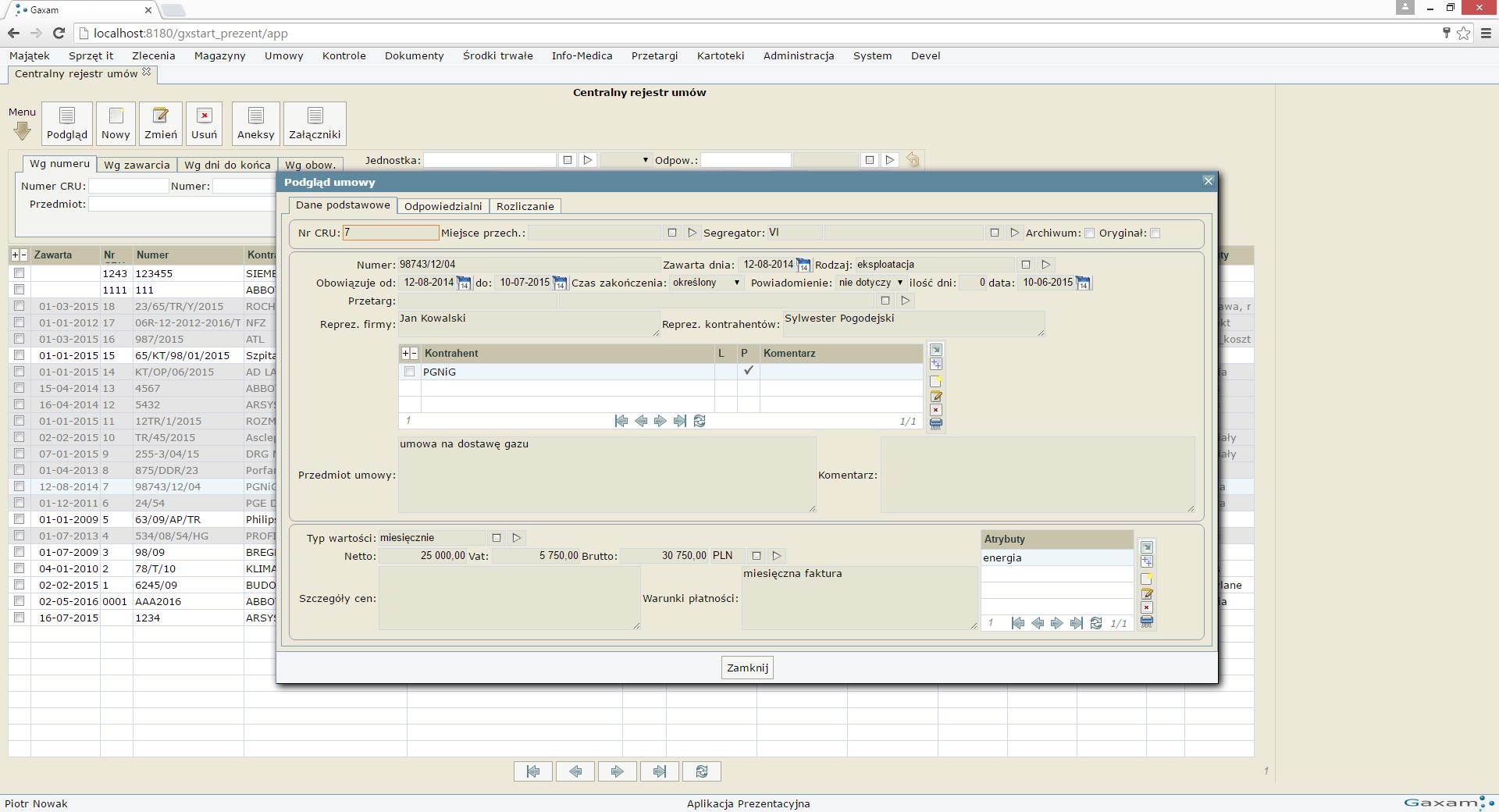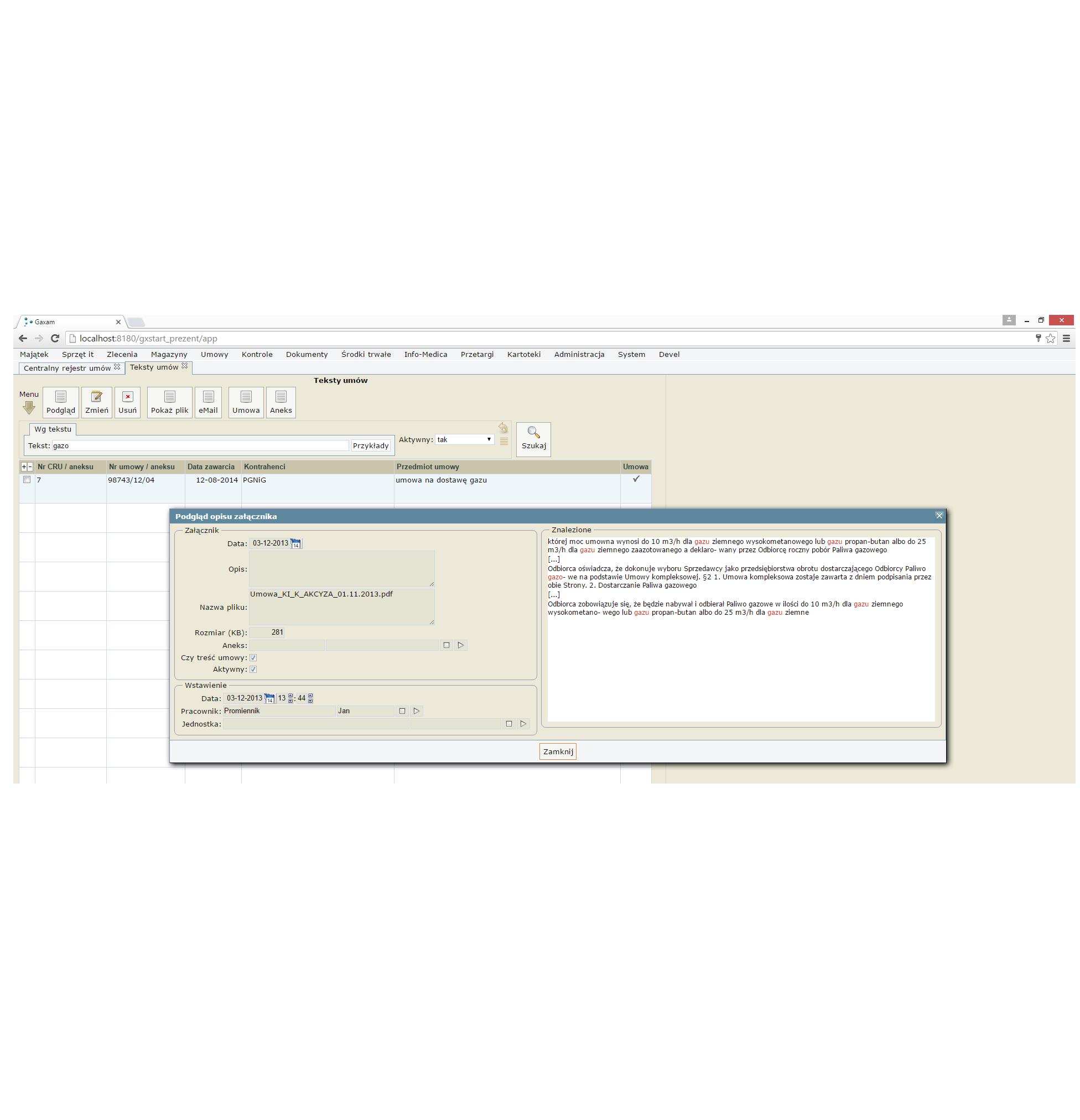 gxCRU, to uwzględniający specyfikę szpitali oraz przychodni system wspomagający rejestrację umów. Oprogramowanie w sposób znaczących pozwala na monitorowanie prawidłowego przebiegu realizacji zawieranych przez jednostkę umów w połączeniu z centralną kartoteką kontrahentów. gxCRU pozwala na łatwe wyszukanie umowy z wykorzystaniem mechanizmu wyszukiwania pełno tekstowego (skan tekstu umowy), kontrolę terminów (w tym mechanizm powiadamiania osób odpowiedzialnych) oraz śledzenie stopnia aktualnego rozliczenia umowy. Centralny Rejestr Umów jest integrowany z innymi systemami firm GAXAM (gxAparatura, gxIT i gxWork) w zleceń i tym umów na naprawy, przeglądy, serwisy etc.