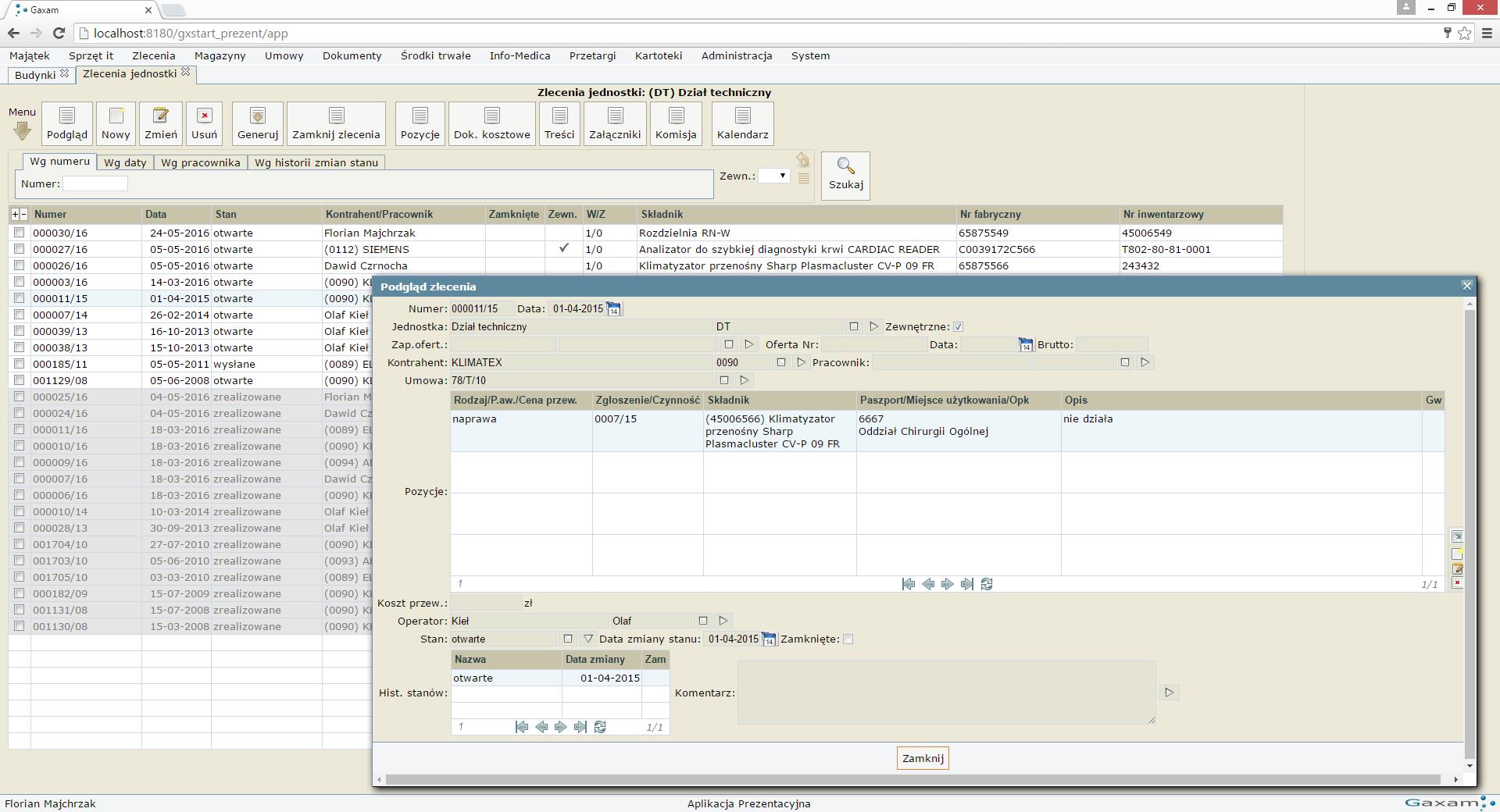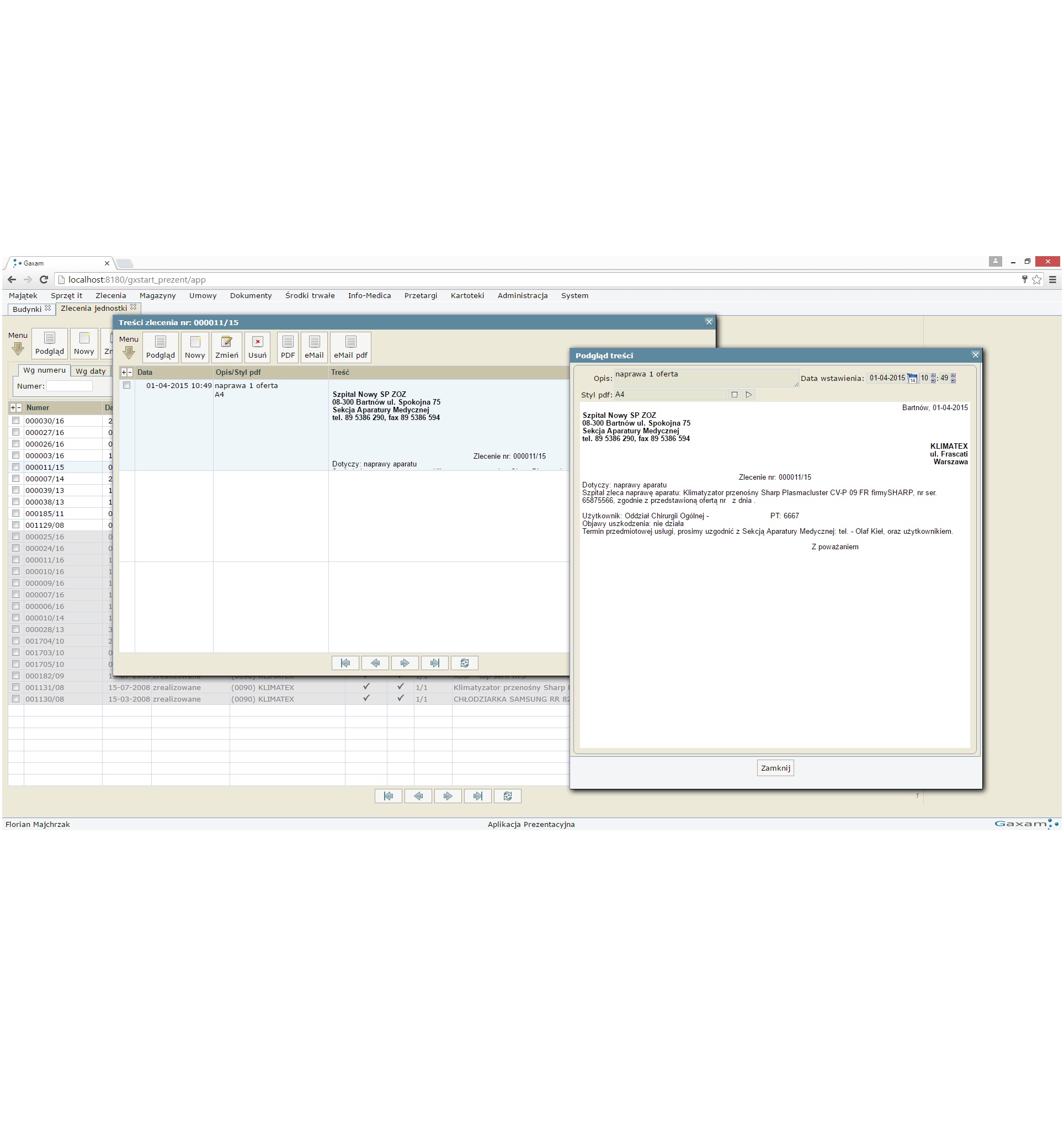 Centralny system zarządzania pracami w ramach budynków umożliwiających wsparcie pracy konserwatorów oraz monitoring kosztów. gxWork podobnie jak gxAparatura posiada rozbudowany system obsługi zgłoszeń (w tym obsługa zleceń, przydzielanie i rozliczanie zadań), który w połączeniu z rejestrem urządzeń niemedycznych oraz sprzętu i budynków dają kompletną informację o prowadzonych pracach. Cechą specyficzną rozwiązanie jest możliwość poruszania się po planie szpitala z dostępem do informacji ilościowych (powierzchnia ścian, okien, ilość gniazdek etc.). Informacje te w istotny sposób pozwalają określić wymiar prac oraz planować koszty. Dodatkowo w skład systemu wchodzi funkcjonalność w zakresie ewidencji pojazdów (przebiegi, ubezpieczenia, koszty napraw etc.).