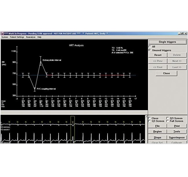 Wykrywanie trudno zauważalnych problemów kardiologicznych dzięki programowi do analizy HRT firmy GE Healthcare. To niezwykle przydatne narządzie diagnostyczne mierzy i porównuje tętno przed i po przedwczesnym skurczu komorowym. Dane z tych porównań używane są następnie do określania stanu autonomicznego układu nerwowego i sercowo-naczyniowego, informując o kondycji kardiologicznej pacjenta.