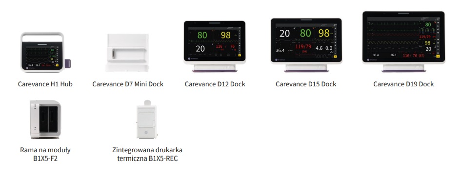 Kliniczne stacje dokujące (do zasilania modułu H1, połączenia z większym ekranem i urządzeniami peryferyjnymi, zawierają 2 gniazda na moduły E oraz 4 medyczne gniazda USB)