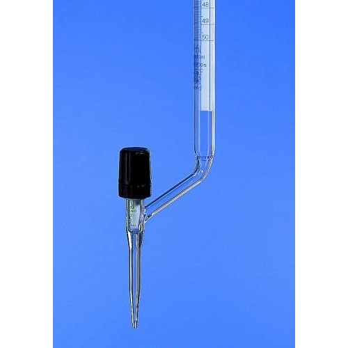 BLAUBRAND®. Wzorcowane na wylew (TD, Ex). Zgodne z normą DIN EN ISO 385. Z paskiem Schellbacha i numerem serii. Zgodność poświadczona certyfikatem. Podziałka i napisy wykonane niebieską, wysoce kontrastową emalią. Długość ok. 800 mm. Wszystkie biurety BLAUBRAND® dostarczane są z numerem serii i jednym certyfikatem serii (w oryginalnym