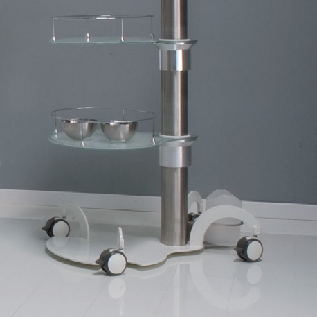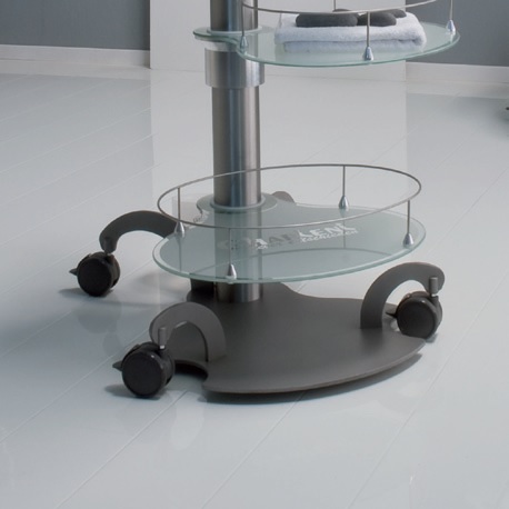 Na wózku Gharieni GlaStyle można przechowywać na dekoracyjnych taflach szklanych z obramowaniem w stałej gotowości niezbędne przybory, sprzęty i preparaty kosmetyczne.