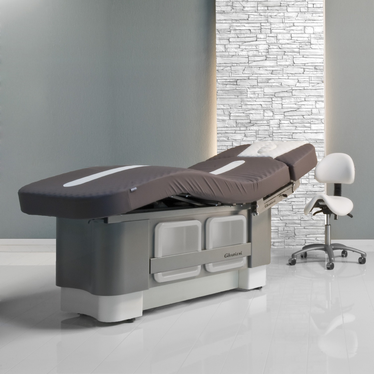 Select - samodzielne kształtowanie własnej leżanki wellness. Każda leżanka MLW F1 Select konfigurowana jest kolorystycznie - niczym samochód osobowy - według indywidualnych potrzeb klienta. Tym samym wszystkie oznaczone części metalowe, jak również te z drewna podlegają możliwości indywidualnego doboru kombinacji kolorystycznej spośród czterech kolorów (biały, tytanowy, ciemnobrunatny, brązowy). Nawet w przypadku bocznych wstawek wybrać można kolor biały lub antracytowy. Podobnie jest z materacem, którego kolor może być biały, kremowy lub czekoladowy! Standardowo F1 Select dysponuje czterema silnikami, które mogą być obsługiwane oddzielnie lub łącznie poprzez różne alternatywne elementy obsługi.