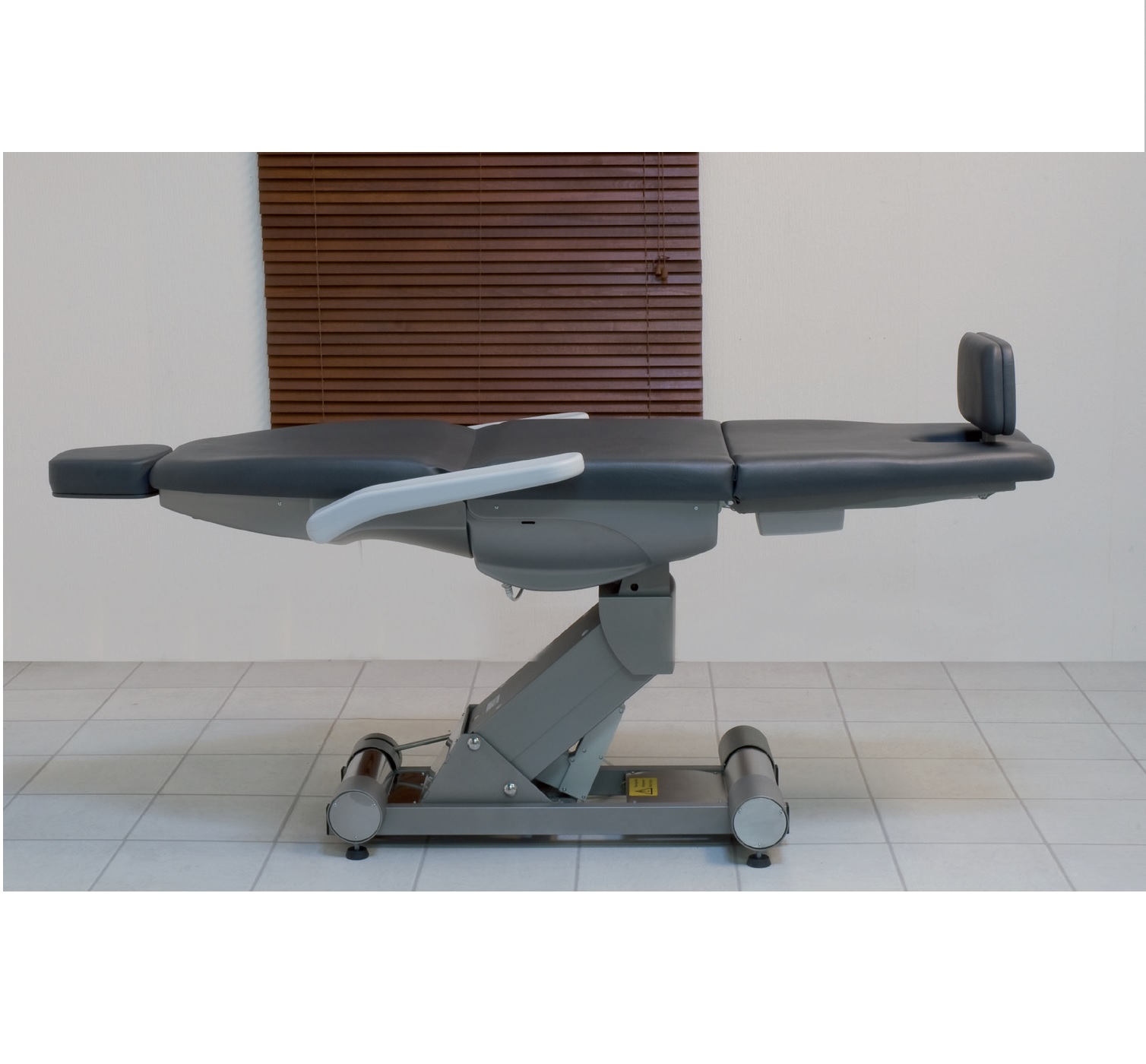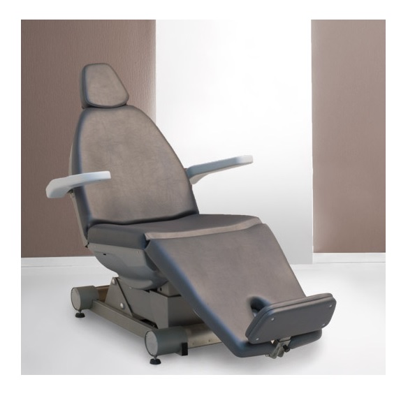 Nowa generacja tych foteli oferuje maksymalny komfort zarówno dla pacjenta jak i dla lekarza czy pielęgniarki. Funkcja pamięci gąbki Memory Schaum pozwala na uformowanie tapicerki w sposób odpowiadający indywidualnemu zaporzebowaniu. 5 silników elektrycznych wspomaga regulację wysokości w zakresie od 54 cm do 83 cm, regulację oparcie, podnóżka, pozycji wypoczynkowej oraz drewnianego podpory pod nogi. Funkcja pamięci położeniależanki pozwala na zaprogramowanie nawet do 8 pozycji. Fotel można w bardzo łatwy i szybki sposób przy pomocy silników elektrycznych oraz mechanicznie przestawić do pozycji “szok”. Konstrukcja fotela jest bardzo stabilna i wykonana jest ze stali pokrytej warstwą lakieru w kolorze tytanowym (inne kolory za dopłątą) z elementami wykonanymi ze stali nierdzewnej. Dzięki dźwigni w podstawie można w łatwy sposób wysunąć kółka i przemieścić fotel w dowolne miejsce. Ze względów higienicznych tapicerka wykonana jest z jednego elementu i nie posiada żadnych szwów. Pozwala to na łatwą dezynfekcję i mycie fotela. Szczególnie ważna jest funkcja przestawienia fotela w pozycję wypoczynkową w dolnej pozycji, ponieważ pozwala to na maksymalne obniżenie nawet do 47cm. Stanowi to duże ułatwienie wchodzenia na fotel osobom mniej sprawnym. Funkcja przestawiania drewnianej podpory pod nogi pozwala na dopasowanie długości do każdego pacjenta. Tapicerka zagłówka i pleców posiada wbudowany magnes, który pozwala na zamontowanie dodatkowej podpory pod kark na każdej wysokości. Fotel w standardzie wyposażony jest w airbag czyli pompowaną powietrzem poduszkę podpierającą kręgosłup na wysokości miednicy. W zależności od zastosowanie fotela istnieje możliwość wyboru różnych wariantów