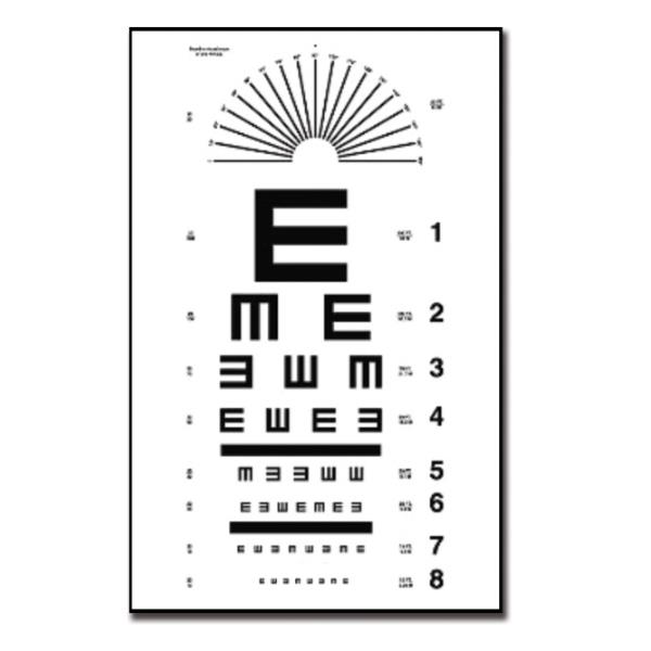 Tablica optometryczna kartonowa wykorzystywana w diagnostyce ostrości wzroku. Czarne optotypy naniesione na białe tło zapewniają dokładność i komfort badania. Tablica przeznaczona jest do badań na odległość 6 metrów.