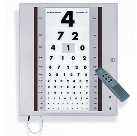 Elektroniczna tablica okulistyczna OKO służy do badania ostrości wzroku. Sterowanie pracą tablicy odbywa się bezprzewodowo - przy pomocy niewielkiego pilota na podczerwień. Tablica z jednym dowolnie wybranym optotypem - cyfry, litery, pierścienie Landolta, haki Snellena, dłonie, obrazki.